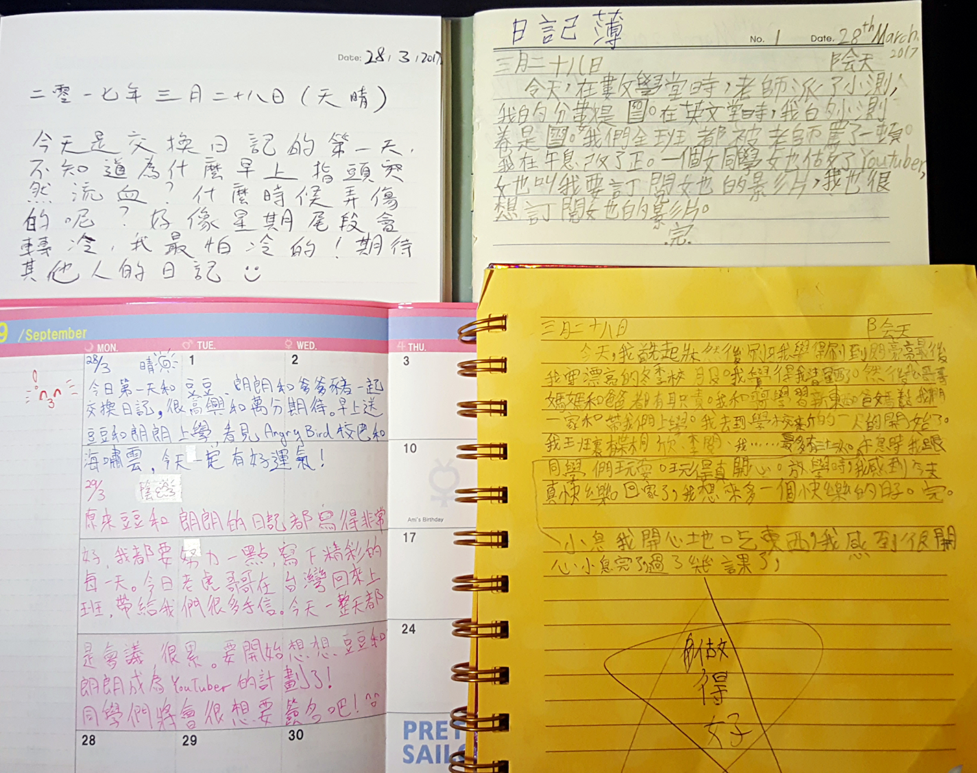今日第一天和豆豆,朗朗和爹爹豬一起交換日記。 很高興和萬分期待。 早上送豆豆和朗朗上學, 看見 Angry Bird 校巴和海嘯雲,今天一定有好運氣!